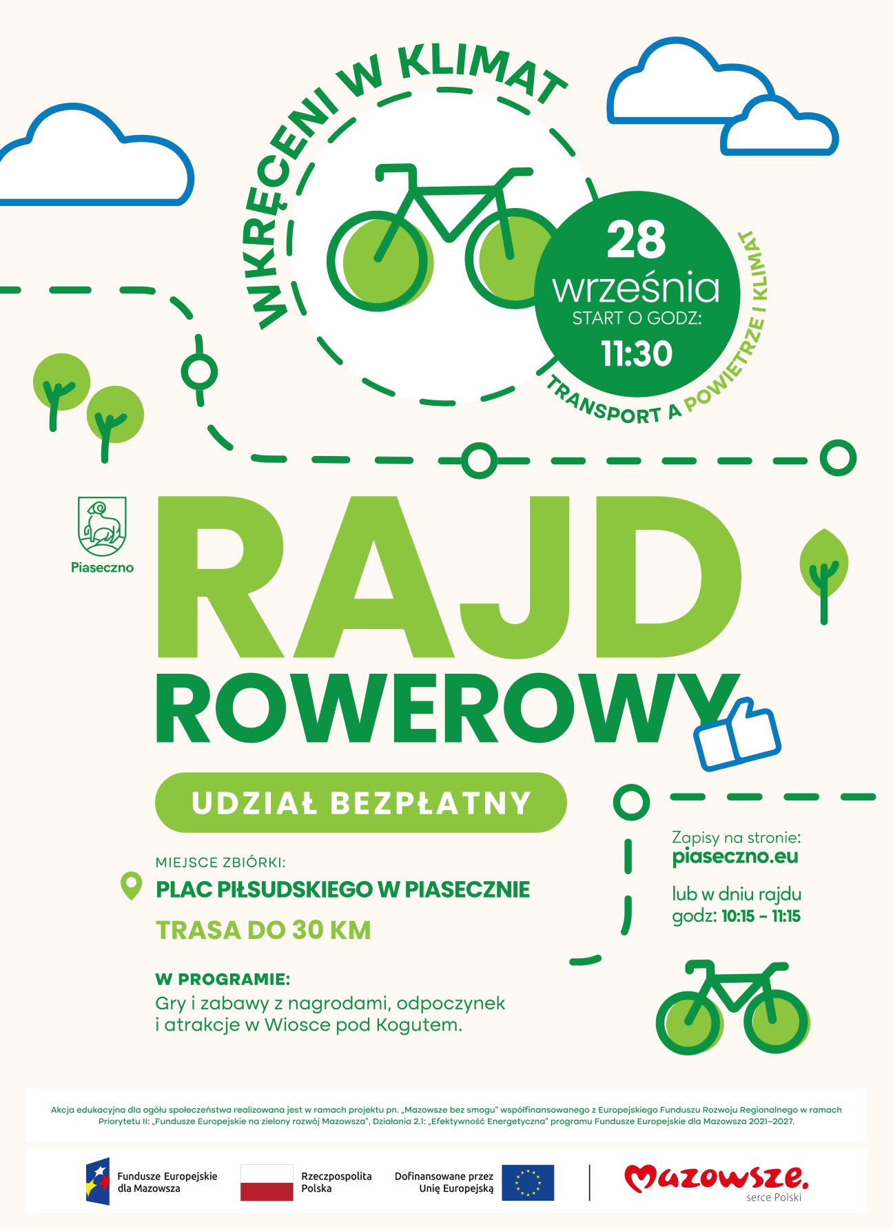 Już w niedzielę, 28 września 2025 roku zapraszamy na Rajd Rowerowy organizowany przez Gminę Piaseczno w ramach projektu „Mazowsze bez smogu”.