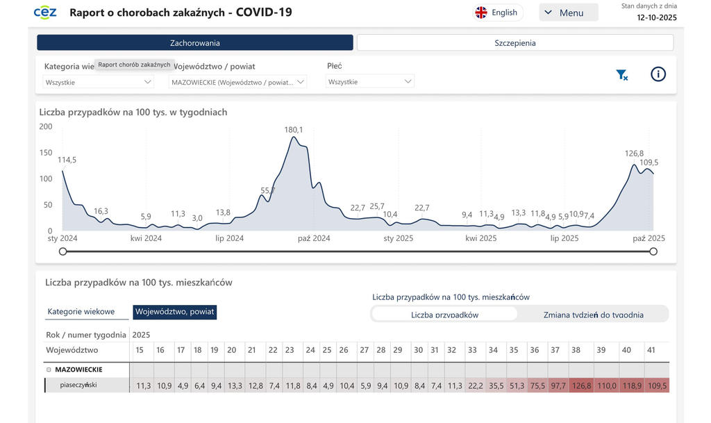 W dniach od 8 do 14 września 2025 roku liczba nowych przypadków COVID-19 w powiecie piaseczyńskim wynosiła zaledwie 22,2 na 100 tys. mieszkańców. W kolejnych tygodniach tempo wzrostu zakażeń gwałtownie przyspieszyło – od 15 do 21 września wskaźnik wzrósł do 35,5, od 22 do 28 września do 51,3, a w dniach od 29 września do 5 października przekroczył 126 przypadków na 100 tys. mieszkańców. To wynik wyższy niż średnia dla większości powiatów Mazowsza. Jeszcze na początku września liczba przypadków była jednocyfrowa, a dziś powiat piaseczyński plasuje się w czołówce regionu pod względem zachorowalności.