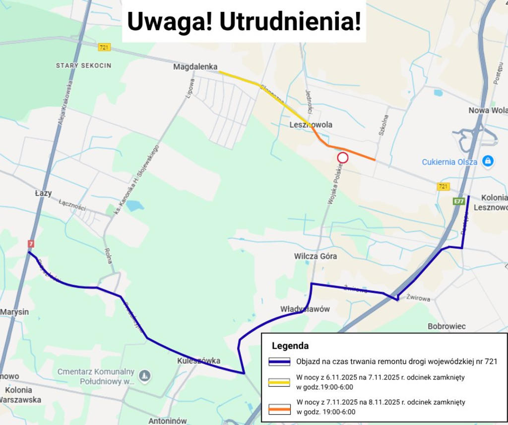 Władze gminy Lesznowola poinformowały, że wkrótce udzielą dodatkowych informacji dotyczących ewentualnych zmian w kursowaniu komunikacji publicznej. W czasie prowadzonych prac obowiązywać będą objazdy, których przebieg przedstawiono na mapach opublikowanych przez Mazowiecki Zarząd Dróg Wojewódzkich. Zarząd apeluje do kierowców o zachowanie ostrożności i stosowanie się do oznakowania, by zapewnić bezpieczeństwo wszystkim uczestnikom ruchu.