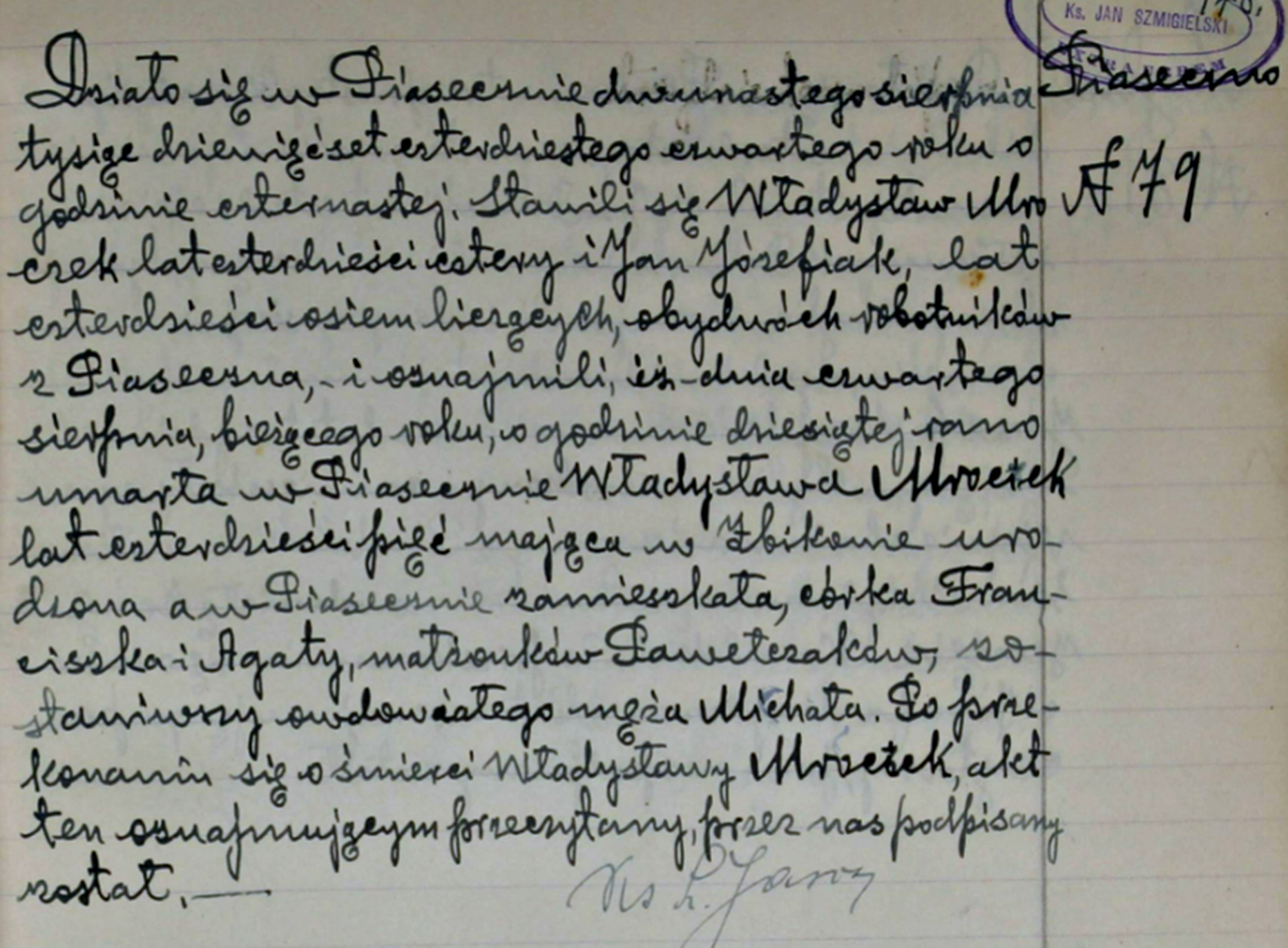 Wśród wymienionych tu osób, które zmarły 4 sierpnia, na tablicy pamiątkowej pomnika nie ma nazwiska Władysławy Mroczek. Odnalazłam jej akt zgonu i z tego dokumentu wynika, że miała w chwili śmierci 45 lat, zmarła o godzinie 9. rano, była córką Agaty i Franciszka Pawelczaków i żoną Michała. Domyślam się, że jej nieobecność na tablicy pomnika wynika z tego, że nie była mieszkanką Orężnej, a pomnik poświęcony jest właśnie im. To jest moja dywagacja, która nie ma uzasadnienia w dokumentach. Odszukałam też akt zgonu innego mieszkańca wsi Orężna, który zakończył życie w Orężnej 4. sierpnia, jest nim Adam Gaworski dziewiętnastoletni młody mężczyzna, tu pozostaje w tajemnicy co się wydarzyło. Można wysnuć wniosek, że ofiar tej strasznej zbrodni było więcej niż przedstawiają zachowane dokumenty. Zbrodniarze nie stanęli przed sądem. Dowiedziałam się też od pani spokrewnionej z zamordowanym w Zalesiu mężczyzną, że rodziny opłacały zbrodniarzy, aby móc ekshumować ciała swoich bliskich na cmentarz.