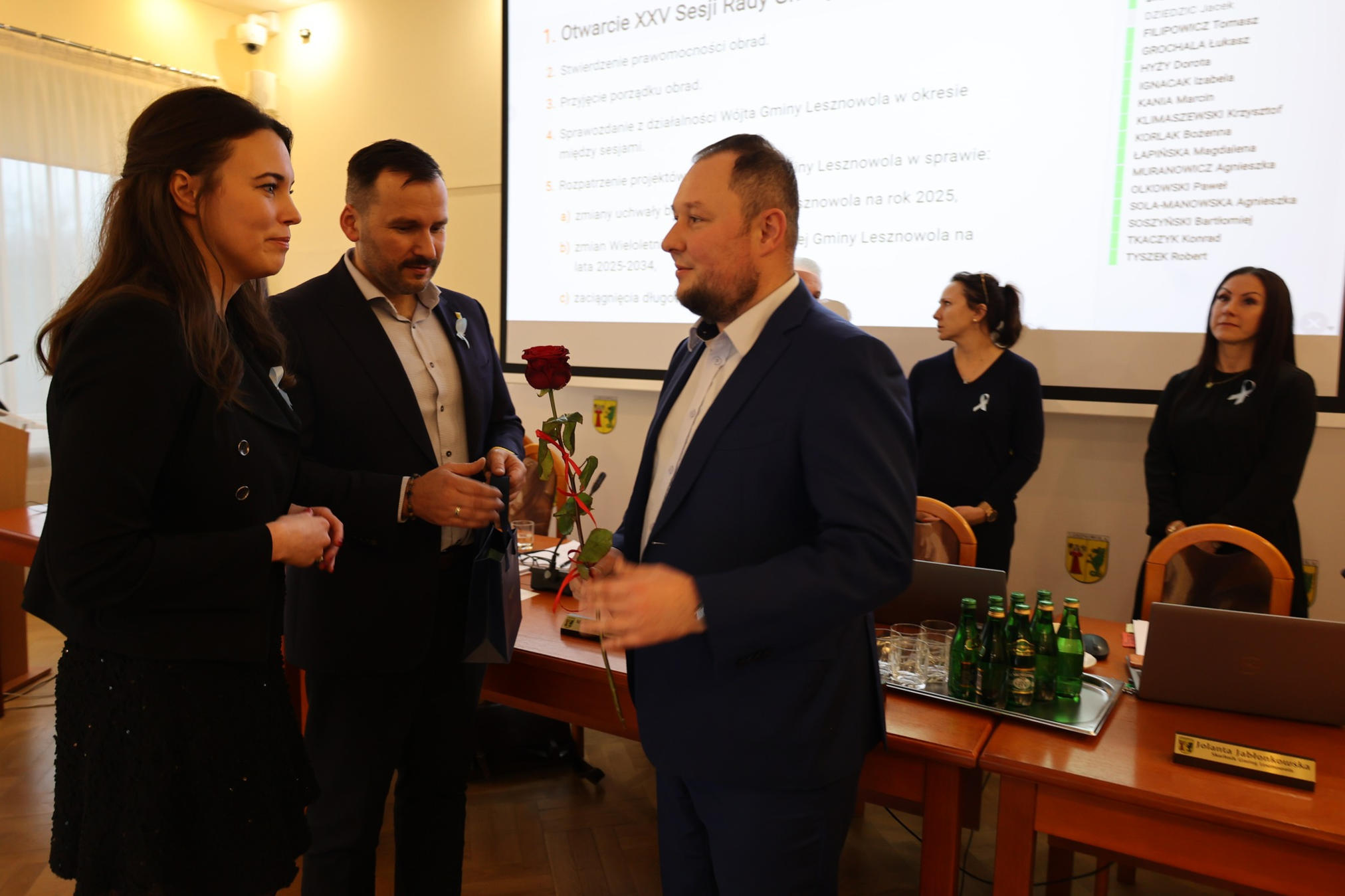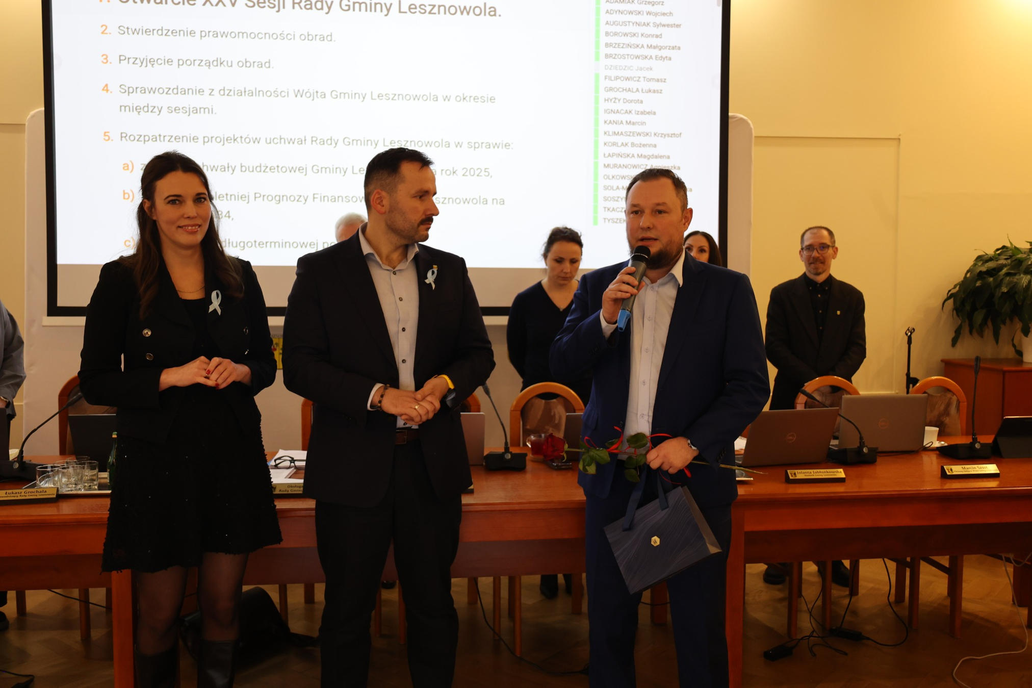 Czwartkowa sesja rozpoczęła się od uroczystego pożegnania Kazimierza Jabłońskiego, który z lokalnym samorządem związany był od 1985 roku. Przez pierwsze lata swojej kariery współpracował z biblioteką gminną, a następnie przez wiele lat kierował Lesznowolskim Przedsiębiorstwem Komunalnym, odpowiadając między innymi za gospodarkę wodno-kanalizacyjną, utrzymanie infrastruktury i współpracę z mieszkańcami.