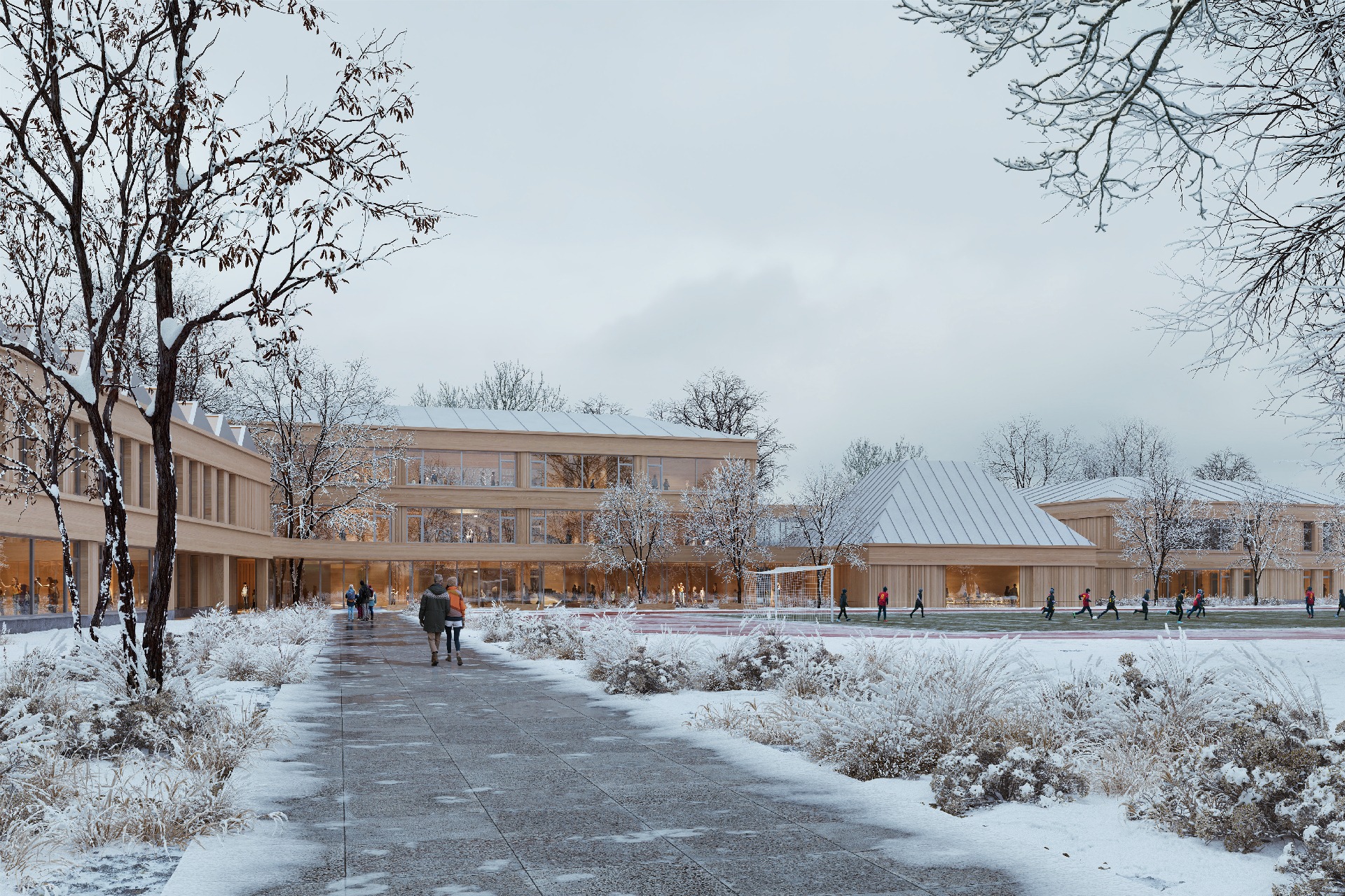 Pierwszą nagrodę zdobyła warszawska pracownia Atelier Tektura, której projekt wyróżnił się spójną wizją nowoczesnego kampusu, dobrze wpisanego w skalę i charakter Tarczyna. Zwycięska koncepcja zakłada stworzenie kompleksu, który ma stać się zarówno centrum szkolnym, jak i miejscem integracji mieszkańców. Centralnym punktem założenia jest boisko z bieżnią – przestrzeń, która ma pełnić funkcję wspólnego miejsca spotkań i aktywności fizycznej. Architekci zaproponowali podział zabudowy na mniejsze, czytelne bryły, co pozwala harmonijnie wkomponować obiekt w otoczenie oraz daje możliwość elastycznej adaptacji układu funkcjonalnego w przyszłości.