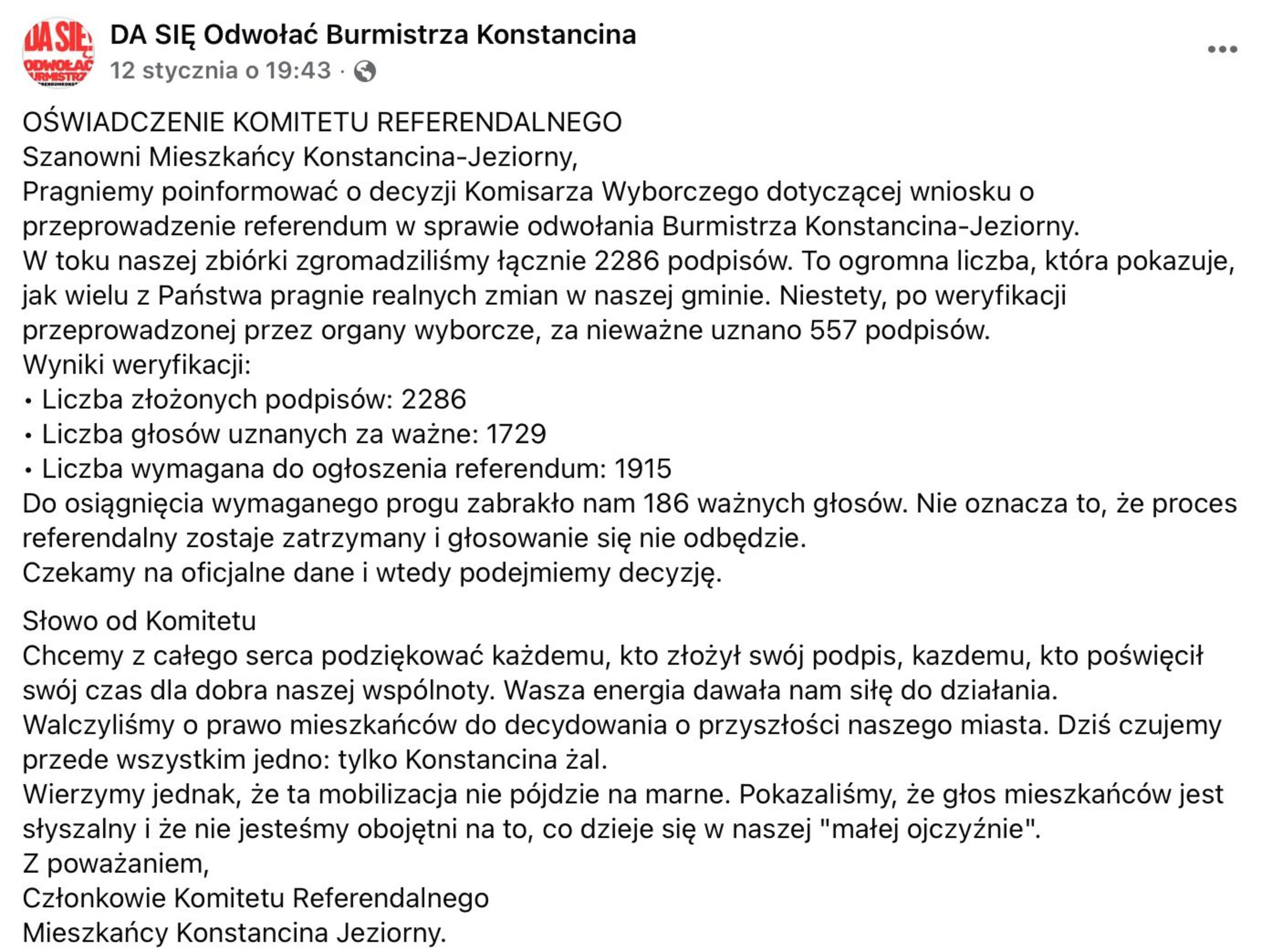 Grupa inicjatorów referendum, skupiona wokół profilu społecznościowego „Da się Odwołać Burmistrza Konstancina”, poinformowała o wynikach weryfikacji. Podkreślono, że brakowało jedynie 186 ważnych podpisów, by rozpocząć procedurę głosowania. Członkowie komitetu podziękowali mieszkańcom za wsparcie i zaangażowanie, uznając zebraną liczbę podpisów za dowód na istniejące potrzeby zmian w gminie.