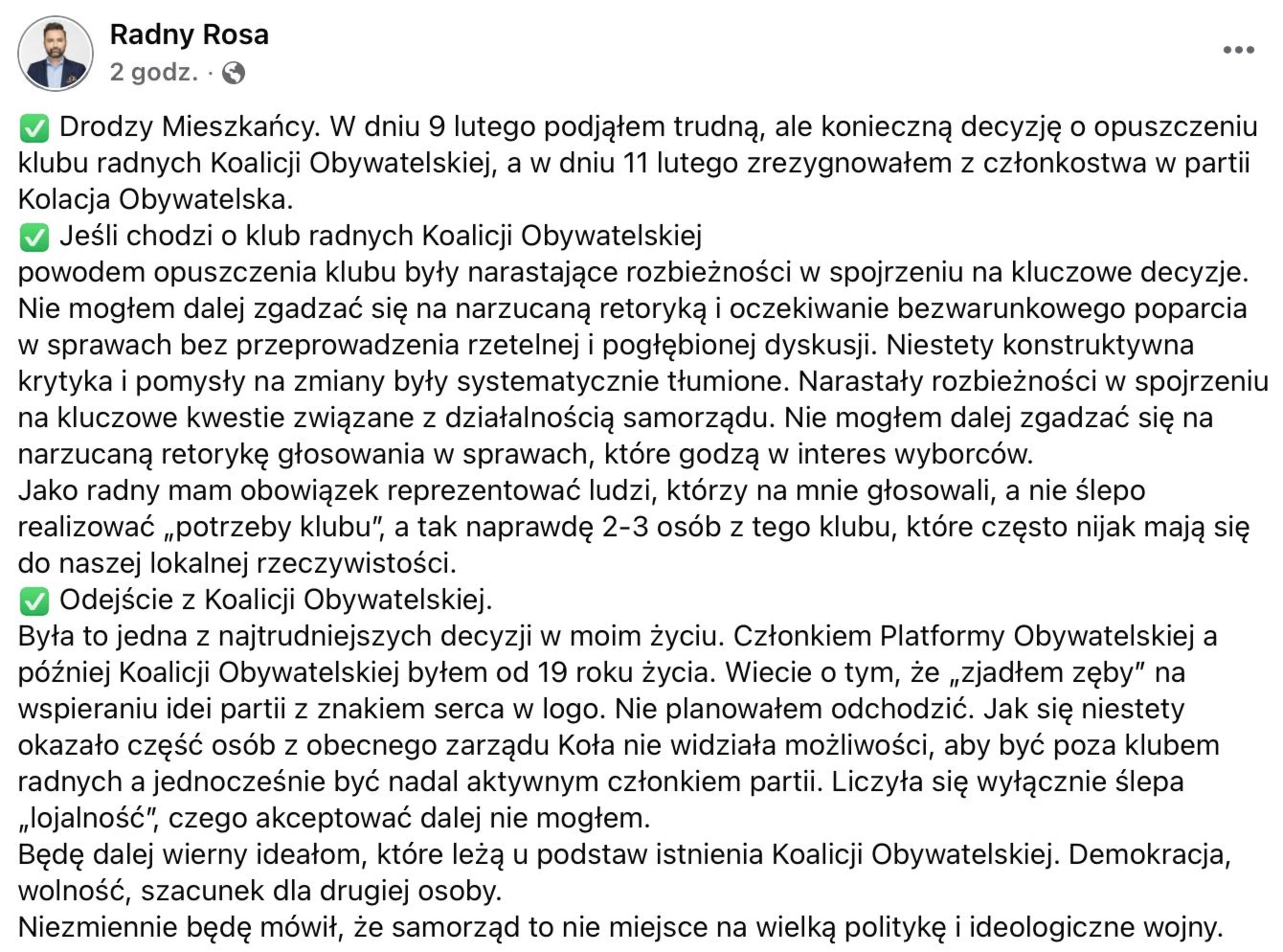 - Nie mogłem dalej zgadzać się na narzucaną retoryką i oczekiwanie bezwarunkowego poparcia w sprawach bez przeprowadzenia rzetelnej i pogłębionej dyskusji. Niestety konstruktywna krytyka i pomysły na zmiany były systematycznie tłumione. Narastały rozbieżności w spojrzeniu na kluczowe kwestie związane z działalnością samorządu. Nie mogłem dalej zgadzać się na narzucaną retorykę głosowania w sprawach, które godzą w interes wyborców – napisał Rosa na swoich profilu społecznościowym.
