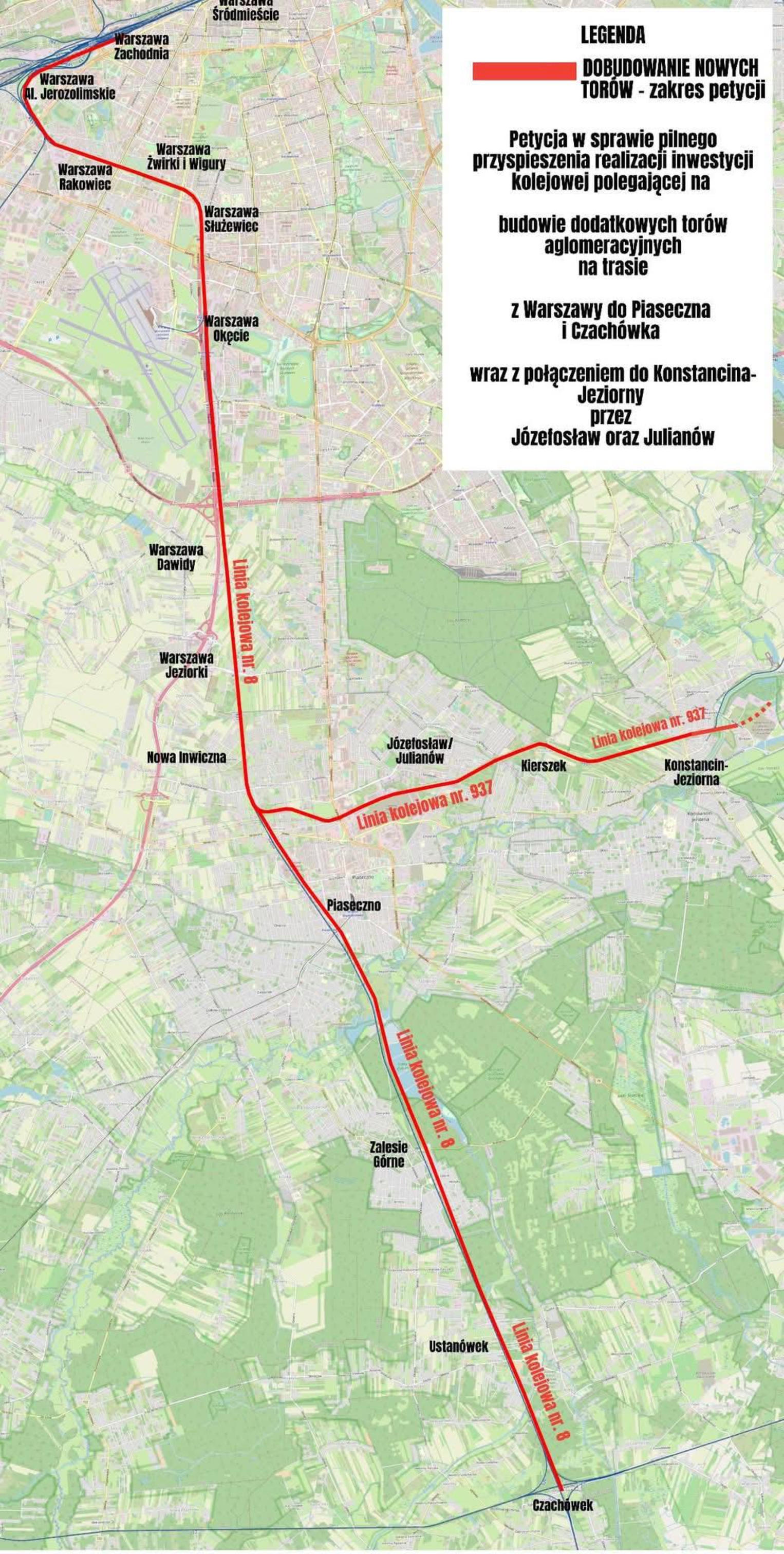 Mieszkańcy Józefosławia, Julianowa i Konstancina-Jeziorny zebrali setki podpisów pod apelem do ministra infrastruktury Dariusza Klimczaka. Petycja, autorstwa Sołtysa i Rady Sołeckiej Józefosławia, domaga się przyspieszenia dobudowy torów aglomeracyjnych na trasie Warszawa – Piaseczno – Czachówek z odnogą do Konstancina przez te miejscowości. Adresowana jest też do PKP PLK, marszałka Mazowsza Adama Struzika, burmistrzów Daniel Putkiewicz (Piaseczno) i Michał Wiśniewski (Konstancin-Jeziorna), wójt Lesznowoli Marty Natalii Maciejak, starosty piaseczyńskiej Ewy Lubianiec oraz prezydenta Warszawy Rafała Trzaskowskiego.