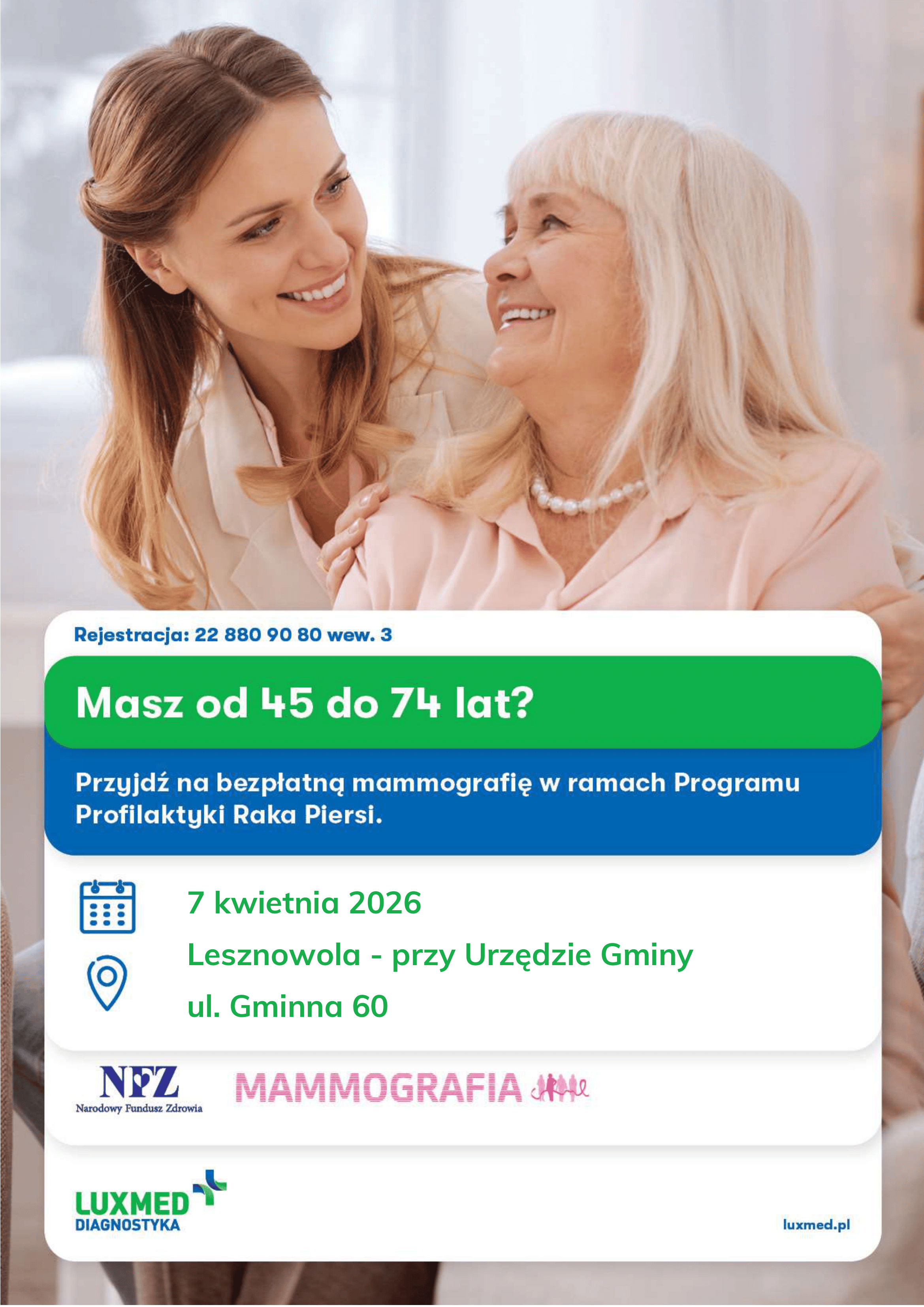 Mobilna pracownia mammograficzna LuxMedu w pierwszej kolejności obsłuży kobiety z Lesznowoli. Nastąpi to we wtorek 7 kwietnia w godzinach 10:00-17:15 przy Urzędzie Gminy, ul. Gminna 60.