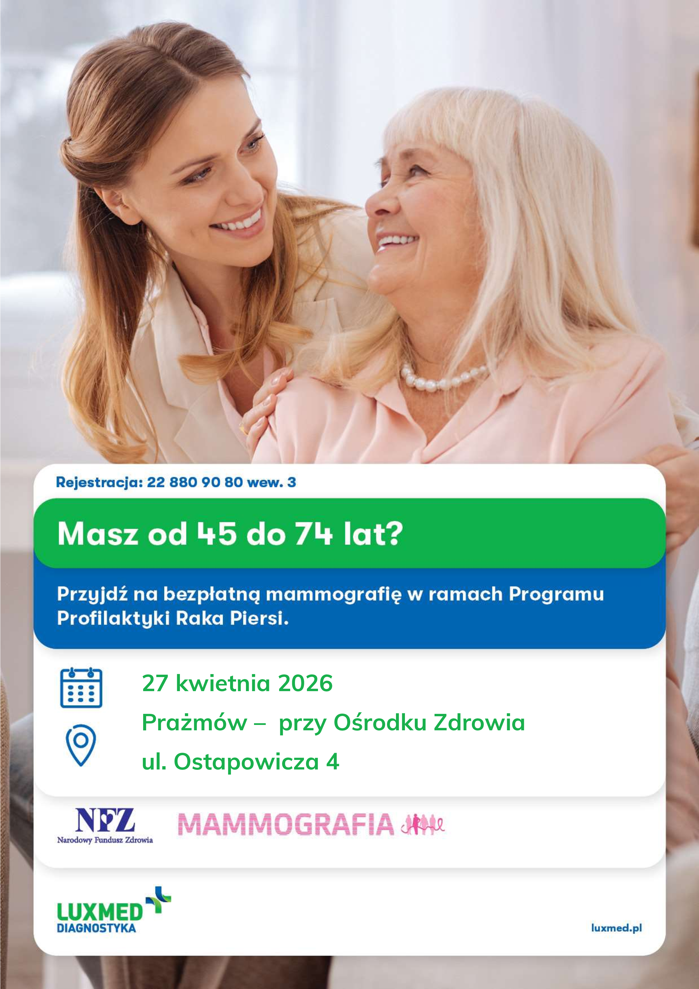 Mieszkanki Prażmowa będą mogły wykonać badanie niespełna 3 tygodnie później, w poniedziałek 27 kwietnia godz. 10:00-16:00 przy Ośrodku Zdrowia, ul. Ostapowicza 4.