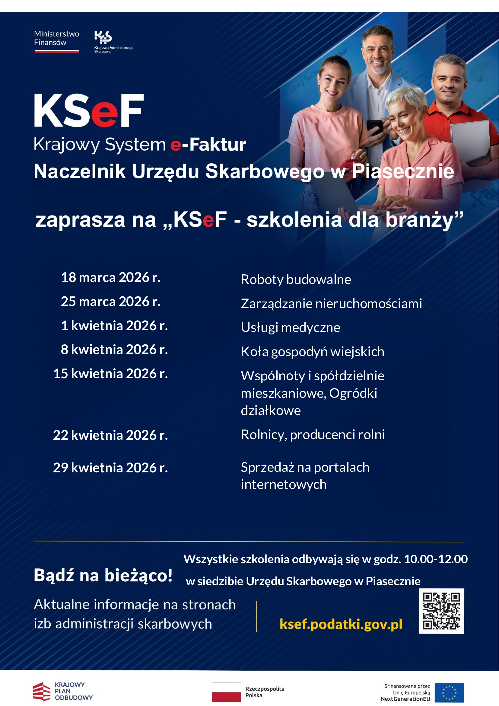 Szkolenia, pt. „KSeF – szkolenia dla branży” odbywają się w każdą środę od 18 marca 2026 r. do 29 kwietnia 2026 r. w siedzibie Urzędu Skarbowego w Piasecznie ul. Energetyczna 5 w godz. 10:00-12:00.