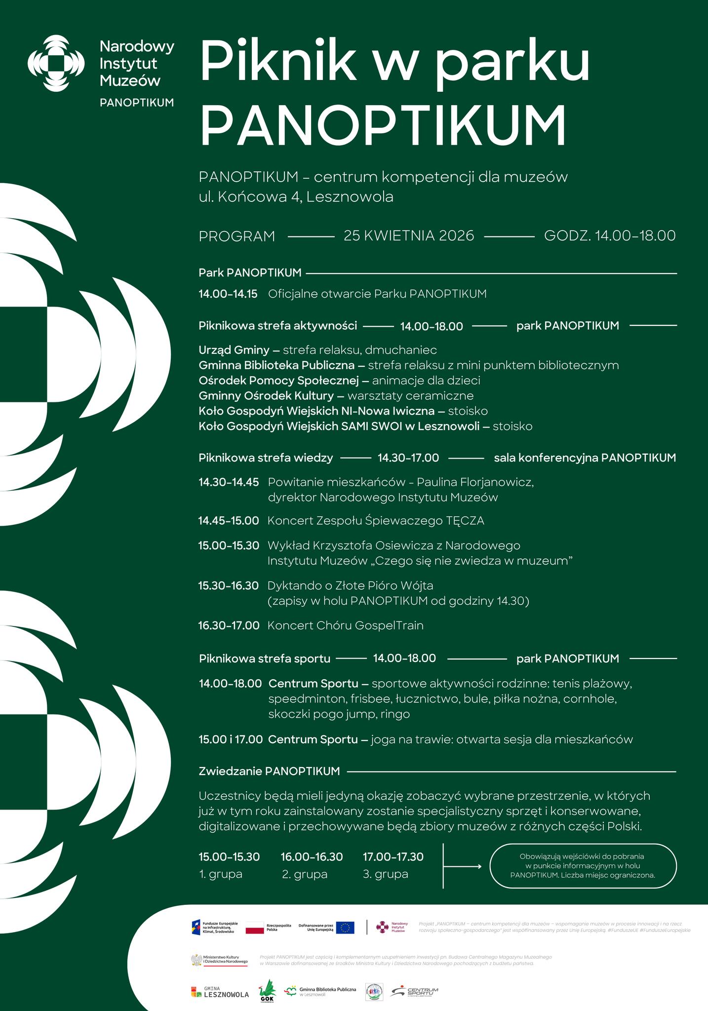 Uczestnicy będą mogli zobaczyć wybrane przestrzenie Panoptikum – centrum, które w przyszłości ma służyć konserwacji, digitalizacji i przechowywaniu zbiorów muzealnych z różnych części kraju. Zwiedzanie obiektu odbędzie się z przewodnikiem i zostanie podzielone na trzy grupy: o godz. 15.00, 16.00 i 17.00. Liczba miejsc jest ograniczona, a o wejściu decydować będzie kolejność zgłoszeń na miejscu, w punkcie informacyjnym w holu. Na terenie parku przez cały czas działać będzie piknikowa strefa aktywności, a także strefa sportu z propozycjami dla całych rodzin.